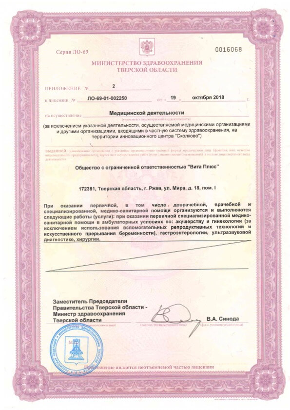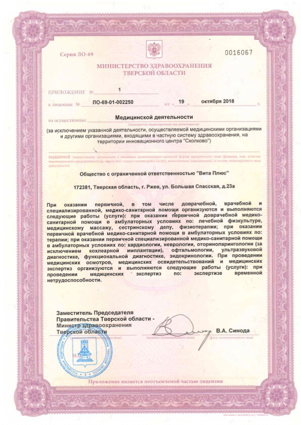 ООО «Вита Плюс» создано в 2006 году на базе ранее ООО « Комфорт Плюс» . ООО « Комфорт Плюс» было открыто в 1997 году, являлось первым частным медицинским учреждением в городе Ржеве. ООО « Вита Плюс» в дальнейшем сокращенно «МЦ ВП» было развернуто осуществление оказания медицинских услуг по ряду специальностей, которые сохранены и по настоящее время. За период с момента открытия было впервые организованна во Ржеве получения всего спектра лабораторных исследований на уровне федеральных центров, с оптимальной скорости логистики по доставки биологических материалов и получения ответа по электронной связи в течении 1-2 суток. Данный вид медицинских услуг сохраняется и по настоящее время. В нашем центре был открыт первый и по настоящее время единственный кабинет аппаратного лечения детей с патологией органов зрения, который был расширен до современного спектра аппаратных методов лечения не только патологии органов зрения, и патологии опорно-двигательной системы, органов дыхания, неврологических, ЛОР заболеваний В настоящее время « МЦ ВП» осуществляет медицинские услуги по неврологии, кардиологии, функциональной диагностики( ЭКГ, холтер, реовазография, велоэргометрия), эндокринологии (включая лечение избыточного веса с подбором индивидуального питания) , терапии, гастроэнтерологии, офтальмологии, оториноларингологии ( УЗИ придаточных пазух носа, тимпанометрия, аудиометрия, эндоскопические исследования полости носа и глотки ), УЗИ диагностики, ( в том числе эластографии печени, молочных желез, простаты, щитовидной железы), гинекологии, хирургии, услуги процедурного кабинета. Мы осуществляем практику социальной гибкости и снижаем стоимость приема пациентов детского возраста, при заборе биологического материала для лабораторных исследований есть скидка для пенсионеров и детей. Весь персонал работает над улучшением качества оказания медицинских услуг. Все медицинские работники имеют аккредитационные удостоверения. Административный состав аккредитован по организации здравоохранения. Для расширения медицинской помощи мы привлекаем специалистов из областного центра. « МЦ ВП» постоянно анализирует информацию от пациентов по качеству оказания медицинских услуг и тем самым стремится к улучшению . Мы будем благодарны за активное участие в устранении недостатков в работе.